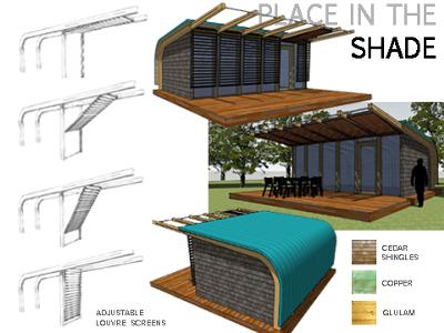 REAR YARD OASIS IS A LOW TECH. CONSTRUCTION SHED THAT ENABLES THE USER TO ADJUST VARIOUS DEGREES OF LIGHT PENETRATION THROUGH THE REMOVABLE ROOFTOP MEMBERS.