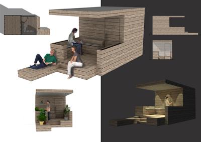 To let people interact with the porch, objects are created for different use, an example is the long lower extension of the porch. This can be use as a sun bed but also as a podium for plant pots. Another way interaction is triggered is done is by keeping the design of the porch shed clean, simple and without decoration so that people can interact by decorating and modify the shed to their own style and use.